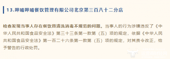值得注意的是,在6月28日,北京市朝阳市场家督管理局官方公众号发布了近期关于近期餐饮单位检查发现问题的处置。据该通报显示,呷哺呷哺餐饮管理有限公司北京第三百八十二分店存在餐饮具清洗消毒不规范的问题,违反了食品安全法的相关规定,监管局对其责令整改,给予警告的行政处罚。