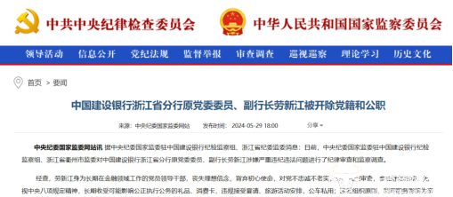 然而,值得关注的是,2023年12月,建行浙江省分行原副行长劳新江因涉嫌严重违纪违法,接受中央纪委国家监委驻中国建设银行纪律审查和浙江省衢州市委员会调查。2024年5月,因严重违纪违法问题,劳新江被开除党籍和公职。