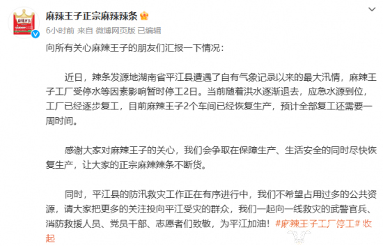 针对此事,麻辣王子官方在微博平台发布了相关的情况说明,其表示麻辣王子工厂受停水等因素影响暂时停工2日。当前随着洪水逐渐褪去工厂已经逐步复工,目前已有两个车间恢复生产,预计全部复工还需要一周的时间。
