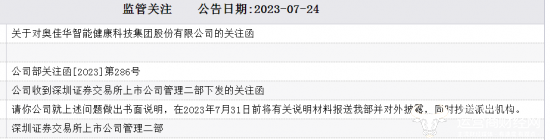值得注意的是,去年7月,奥佳华曾收到深圳证券交易所上市公司管理二部下发的关注函(公司部关注函[2023]第286号)。