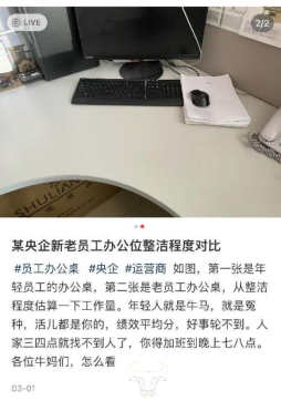 网友表示:从整洁程度估算一下工作量。年轻人就是牛马,就是冤种,活儿都是你的,绩效平均分,好事轮不到。人家三四点就找不到人了,你得加班到晚上七八点。