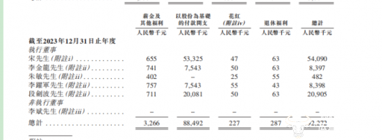 值得一提的是,招股书还显示,2023年,宋中杰的薪酬还具有5409万元,其中薪金及其他福利65.5万,以股份为基础的付款开支5332.5万元。