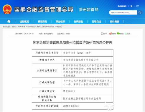此外,值得一提的是,2024年5月11日,国家金融监管总局官网披露,贵阳贵银金融租赁有限责任公司因为存在“租后管理不到位,融资租赁款被挪用”等三项违法违规事由,被罚款90万元。该公司为贵阳银行旗下子公司,贵阳银行作为其控股股东,持有该公司67%的股份。