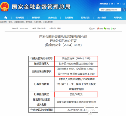 此外,值得一提的是,2024年5月7日,国家金融监督管理总局洛阳监管分局公开披露了对恒丰银行洛阳分行的行政处罚。洛阳分行因贷前调查不到位,贷后管理不尽职;银行承兑汇票贸易背景审查不尽职被国家金融监督管理总局洛阳监管分局处以罚款60万元。