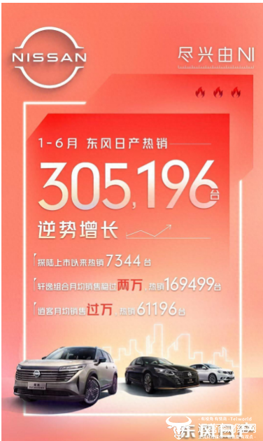 日前,东风日产公布了6月份销量快报。报告显示,东风日产1-6月累计销量达305196辆,其中轩逸组合月均销量超两万台,1-6月累计销量为169499辆。