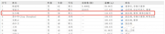 据东方财富网显示,公司内共有4位副总裁,其中伍小峰的薪酬是116万,其他三位副总的薪酬都在150万以上,与他们相比,伍小峰的薪酬不算高了,比如副总裁吴秋云去年薪酬165万,副总裁景中华去年薪酬150万。当然,也有公司高管不如他的薪酬高。