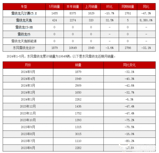 数据显示,5月份东风雪铁龙的销量为1879辆,同比下降32.1%,环比下降3.6%;今年1-5月份,东风雪铁龙累计销量10649辆。