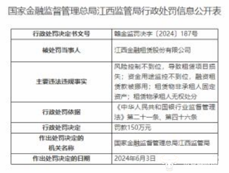 值得一提的是,2024年6月11日,国家金融监督管理总局网站公布的江西监管局行政处罚信息公开表显示,江西金融租赁股份有限公司由于风险控制不到位,导致租赁项目损失;资金用途监控不到位,融资租赁款被挪用;租赁物非承租人固定资产;租赁物承租人无权处分被罚款150万元。