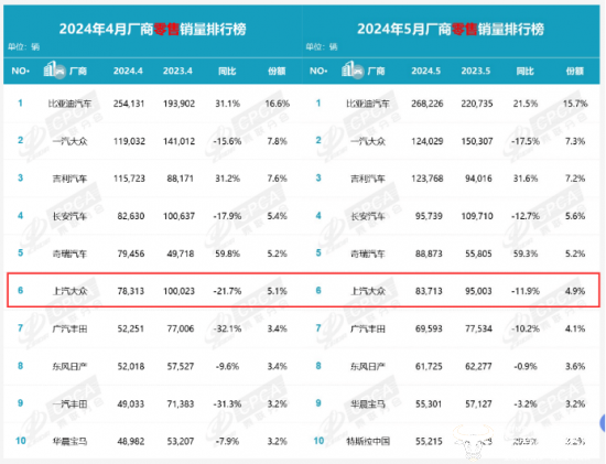 但是,乘联会数据显示,2024年4月份,上汽大众单月零售销量为78313台,位居同期车企零售销量榜第6名,跌出了国内车企零售销量榜前5名,首次被奇瑞汽车反超。2024年5月份,上汽大众单月零售销量为83713台,与4月份一样是第5名。