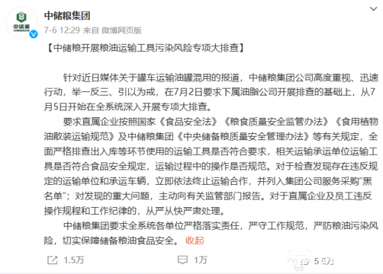 针对此事,中储粮油脂(天津)有限公司的母公司,即中储粮集团官方在微博发布了相关说明,称将开展粮油运输工具污染风险专项大排查等。但汇福粮油集团却并未进行公开声明,仅有媒体报道该集团工作人员称公司的成品罐装油质量过关,公司没有罐装车,报道涉及的都是罐车是“客户自备”。