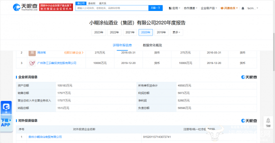 据天眼查小糊涂仙集团2020年度报告显示,小糊涂仙该年销售总额为1.75亿元,利润总额为5673万元,营业总收入中主营业务收入为1.75亿元,净利润为5260万元。