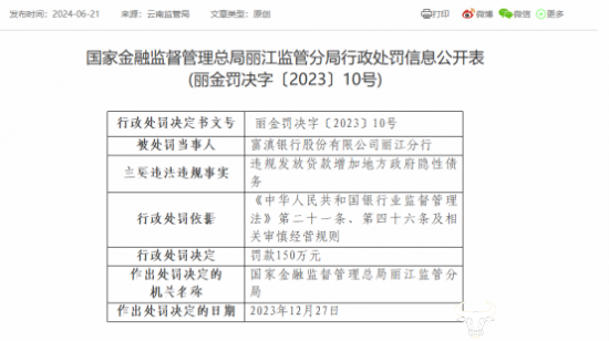 然而,值得一提的是,2024年6月24日,国家金融监督管理总局丽江监管分局行政处罚信息公开表显示,富滇银行丽江分行因违规发放贷款增加地方政府隐性债务,被罚款150万元。