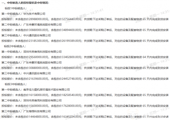 标段1的三位中标候选人分别为华为技术有限公司、广东申菱环境系统股份有限公司、中兴通讯股份有限公司;标段2的三位中标候选人分别为深圳市英维克科技股份有限公司、广东申菱环境系统股份有限公司、中兴通讯股份有限公司;标段3的三位中标候选人分别为南京佳力图机房环境技术股份有限公司、深圳市英维克科技股份有限公司、广东海悟科技有限公司。