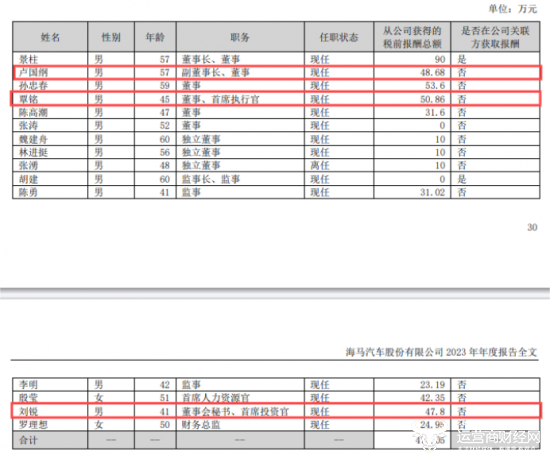海马汽车2023年年报显示,刘锐去年从公司取得了47.8万元的薪酬。不过,从整个汽车行业来看,海马汽车高管的薪酬一直都不算很高。比如,首席执行官覃铭去年的薪酬为50.86万元,而副董事长卢国纲去年的薪酬也才48.68万元,刘锐与他们差距不大。但海马汽车高管的薪酬与国内汽车业高管的普遍水平相比,差距比较大。