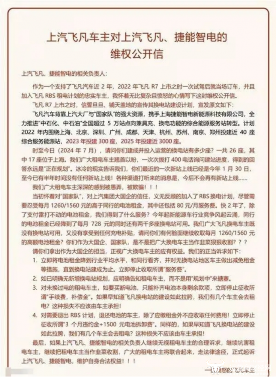 除此之外,近日,就有一位上汽飞凡R7的车主通过一封公开信维权,表达了对上汽飞凡与捷能智电的不满。