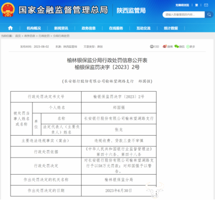值得关注的是,在袁颖丽上任前夕,2023年8月,国家金融监督管理总局官网显示,长安银行榆林望湖路支行因“违规收费、贷款三查不审慎”,被监管罚款58万元。
