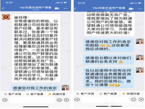 四星客户雷先生,因经常收到垃圾短信和营销电话而产生抱怨,崔亚红得知此事后第一时间通过10018会员专线联系客户,主动询问原因。开始,客户好一通报怨,言辞颇为激动,但无论客户说什么,崔亚红都耐心、用心聆听客户诉求并认真记录。她首先安抚客户情绪,同时,联系相关部门解决客户诉求,最后主动邀请客户添加企业微信,为客户提供“一对一”VIP服务,确保客户问题能够得到快速解决。在问题解决后,崔亚红及时跟进,主动联系客户询问后续使用情况,最终雷先生被崔亚红的耐心、真诚、专业所打动,给予VIP客户经理崔亚红高度认可与鼓励!