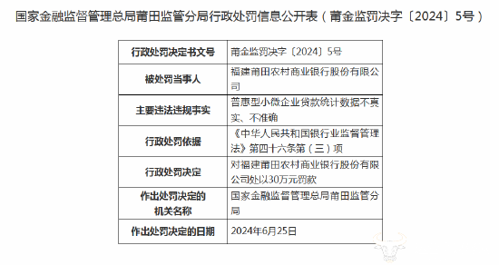 然而,值得一提的是,2024年7月1日,国家金融监督管理总局莆田监管分局发布的行政处罚信息公开表显示,莆田农商行因在普惠型小微企业贷款统计数据上存在不真实、不准确的问题,被监管部门处以30万元的罚款,作出处罚决定的日期是2024年6月25日。