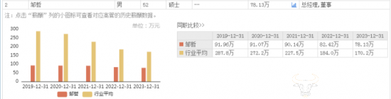 值得注意的是,邹哲的年薪近几年逐年下降,从2019年的91.96万到2022年的82.42万,2023年已经降到了78.13万元,一共降薪13.83万元。