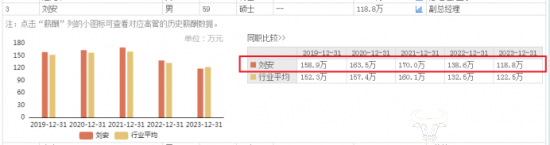 值得注意的是,近三年刘安连续降薪,2021年年薪为170.0万,2022年为138.6万,2023年为118.8万元,共降薪51.2万元。