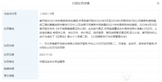天眼查显示,2023年12月1日,首开股份收到《行政处罚决定书》,由于2021年年报存在错报,北京证监局决定对公司给予警告,并处以150万元的罚款。对时任董事长李岩、时任董事兼总经理赵龙节、时任总会计师容宇给予警告,并分别处以60万元的罚款。不过被罚高管中并没有没有刘安,所以,此事应该与他无关。