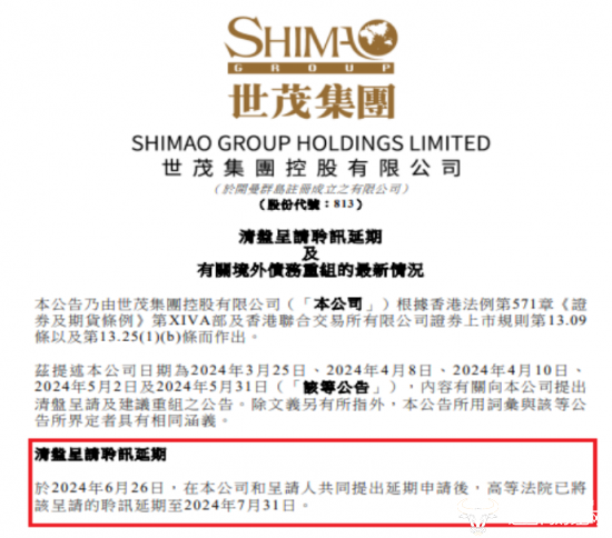 6月26日,世茂集团又发布一则公告,称和呈请人共同提出延期申请,高等法院已将该呈请的聆讯延期至2024年7月31日。