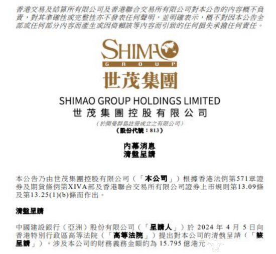 值得注意的是,2024年4月8日,世茂集团发布公告,称中国建设银行(亚洲)股份有限公司于2024年4月5日向香 港高等法院提出对本公司的清盘呈请,涉及公司的财务义务金额约为15.795亿港元。