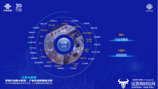 最后朱常波主任在会上宣布,联通元景落地成效显著,目前已形成35+行业大模型和100+个标杆应用,并在诸多场景助力提质增效。现场还发布了中国联通和广大合作伙伴一起落地的百个优秀案例,例如辽宁12345省级平台的全部坐席已全面接入政务热线大模型,实现了工单填单时间缩短80%,工单记录完整度提升30%,内容推荐准确率提升35%。上述35个行业大模型和100个优秀案例中有许多也入选了国际国内重要奖项,如医疗大模型入选ITU AI4G优秀案例,城市治理大模型、港口大模型入选世界人工智能大会优秀案例,文创大模型入选全球数字经济大会优秀案例。丰富的落地应用实践让元景大模型赢得了“更懂行业的大模型,产业升级智能引擎”的口碑和鲜明特色。