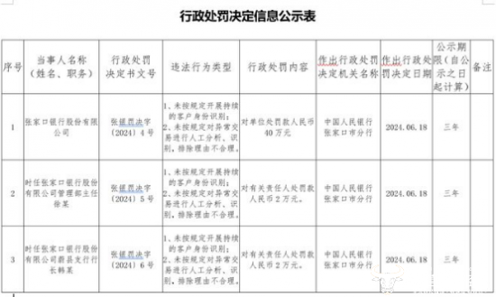 然而,值得关注的是,2024年6月24日,据中国人民银行河北省分行消息,张家口银行因未按规定开展持续的客户身份识别;未按规定对异常交易进行人工分析、识别,排除理由不合理被罚款40万元,作出行政处罚的决定日期为2024年6月18日,公示期为三年。