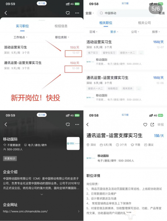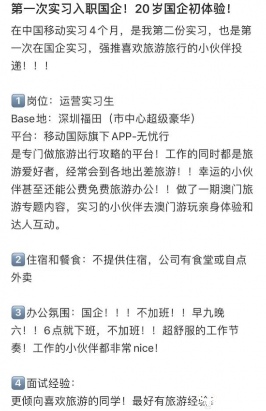 据了解,网友就职于中国移动全资子公司:中国移动国际有限公司,是其旗下APP无忧行的运营实习生。