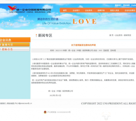 而当时在插旗菜业官网中看到,统一、康师傅等方便面企业均是其合作伙伴,此事也使得统一受到巨大关注。