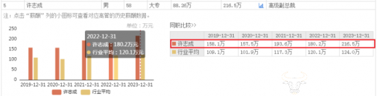 此外,从2019年到2023年,许志成的年薪从158.1万元涨到216.5万元,共涨薪58.4万元。由此可见,许志成的学历虽不算高,但是能力优秀,公司对他十分重视。