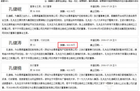 根据同花顺数据显示,孔健涛的年薪为422.9万,与其他两位哥哥孔健岷、孔健楠相同。