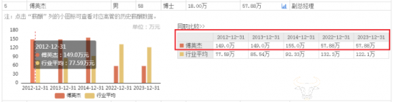 值得一提的是,傅英杰近两年的年薪较之前下降不少。根据东方财富网数据显示,2012年和2013年傅英杰的年薪为149万元,2014年为155万元,而在2022年和2023年都为57.88万元,对比2014年降薪97万元。