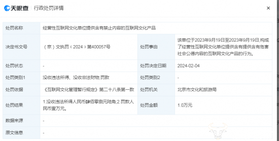 据悉,该公司还曾在今年2月4日因违法违规被罚款1万元。据行政处罚决定书“京)文执罚〔2024〕第400057号”显示,该单位构成了经营性互联网文化单位提供含有危害社会公德内容的互联网文化产品的行为,因此,北京市文化和旅游局对其进行了处罚。