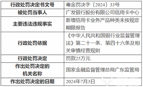 此外,值得一提的是,2024年7月15日,国家金融监督管理总局广东监管局公布的行政处罚信息显示,广发银行信用卡中心则因新增信用卡业务产品种类未按规定期限报告,被罚款25万元。