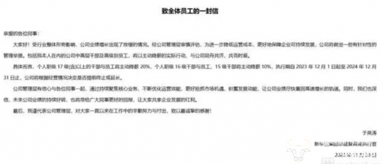 该全员信中称,公司个人职级17级(含)以上的干部与员工将主动降薪20%,个人职级16级干部与员工、15级干部将主动降薪10%,执行期自2023年12月1日起至2024年12月31日止,公司将根据经营情况决定是否提前终止或延长。