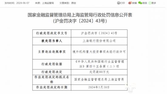 此外,值得一提的是,2024年6月7日,国家金融监督管理总局上海监管局发布了一张针对上海银行的罚单。上海银行由于境外机构重大投资事项未经行政许可被罚款80万元,作出处罚决定的日期是5月30日。