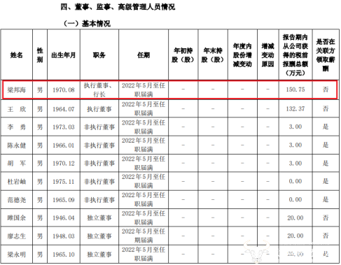 据2023年报显示,梁邦海的薪酬为150.75万。在该行高管薪酬中,只有副行长黄长松的薪酬183.6万在梁邦海之上。