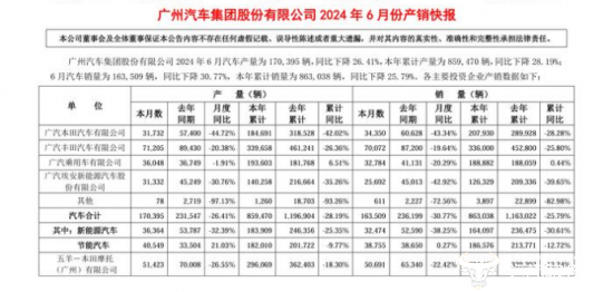 广汽集团6月份产销快报显示,6月份广汽集团的销量为16.35万辆,同比下滑30.77%;今年1-6月份,广汽集团累计销量86.3万辆,同比下滑25.79%。
