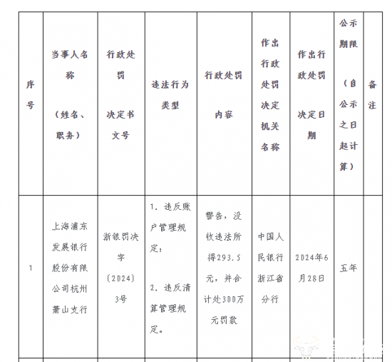 具体来看,萧山支行因“违反账户管理规定、违反清算管理规定”被中国人民银行浙江省分行警告,没收违法所得293.5元,并合计处300万元罚款。