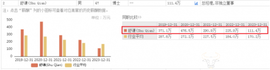 根据东方财富网数据,从2020年至2023年,舒谦连续三年降薪,2020年舒谦的年薪高达476.5万元,2021为290.9万,2022年225.9万,2023年为111.4万,这三年一共降薪365.1万元。