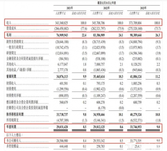 招股书显示,2021年-2023年,美的集团的收入分别为3433.61亿元、3457.09亿元、3737.10亿元。公司毛利分别为769.10亿元、833.87亿元及983.90亿元,复合年增长率达到13.1%,对应毛利率分别为22.4%、24.1%及26.3%。