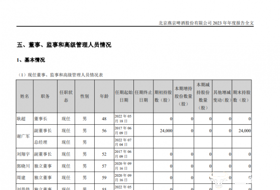 此外值得一提的是,在7月24日,燕京啤酒派发了2023年度的分红,而截至去年底,谢广军持有公司2.4万股股份,按照公司分红方案,他此番能分得2400元,不算多。但他是公司高管中唯一持有公司股份的,这个分红算得上是高管里独一份。