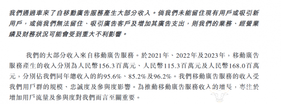 从产品结构来看,车来了的收入主要来源于两方面,移动广告和数据技术服务。2021年至2023年,车来了总营收分别为1.63亿元、1.35亿元及1.75亿元,但其中移动广告服务收入分别为1.56亿元、1.15亿元及1.68亿元,分别占当年度总收入的比例高达95.6%、85.2%以及96.2%。