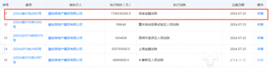 值得一提的是,根据资料显示,融创中国7月多次被执行,执行标的金额巨大。其中7月22日,被执行9次,其中一次被北京金融法院执行标的10.199776亿元,案号为(2024)京74执885号;7月23日,被执行6次,其中一次被成渝金融法院执行17.4654528亿元,案号为(2024)渝87执2662号。
