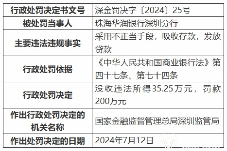 然而,值得一提的是,2024年7月23日,据深圳金融监管局披露的行政处罚信息公开表,华润银行深圳分行采用不正当手段吸收存款,发放贷款,被处以没收违法所得35.25万元、罚款200万元的处罚。