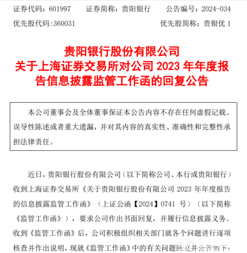 此外,值得一提的是,近期,贵阳银行收到了来自上海证券交易所的《关于贵阳银行股份有限公司2023年年度报告的信息披露监管工作函》,监管工作函对贵阳银行年报中有关经营业绩、信贷资产、存款结构三个方面提出疑问,要求该行作出书面回复,并就上述因素是否可能影响公司业绩和经营充分提示风险。