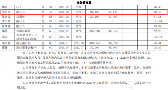 据贵阳银行2023年报,李松芸的薪酬为53.59万,该行共三位副行长,其中李松芸在任时间最久,但薪酬却是最少的。不过,副行长李宁波、何开强二人的薪酬还包含2023年兑现其任中层管理人员期间的绩效薪酬和延期支付。
