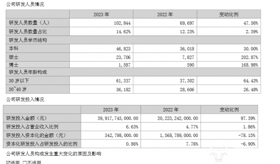 比亚迪研发人员没有专科毕业的,此外其2023年大幅度提高了硕博毕业的研发人员的比重。从这一点来看似乎比亚迪研发人员质量更高。不过,另一方面也说明赛力斯不是“唯学历论”的企业。